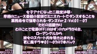 <3DCGによるシチュエーションムービーです。動画1本>今回はさらに、扇風機が地面に設置されており、踊る彼女のミニスカートが強風で煽られて捲れまくっています。東京大学を卒業し、最大手のマスコミ・テレビ局に女子アナウンサーとして入社した沙耶。早朝のニュースの顔として活躍していますが、ある日プロデューサーから業務命令が。持ち前のダンスをニュースの冒頭で披露せよ、とのこと。しかし、いざ現地に行ってみると、踊る場所に4箇所、まるで彼女のスカート内をローアングルから覗き込むように設置されていたのです。猛抗議する彼女。しかし、TV局の役員レイヤーからの命令であるということと、電源はOFF、ただのモックのDVカムであり録画されることはまずないということ、とにかくTVは話題が重要とのことで、ジョークだとのことでした。しぶしぶ了承する沙耶。しかし・・・案の定ヽ(゜▽、゜)ノ(笑)バッチリ撮影されており、かつスローモーションでじっくりと彼女のパンティを鑑賞できるようになっておりました。 d_694781