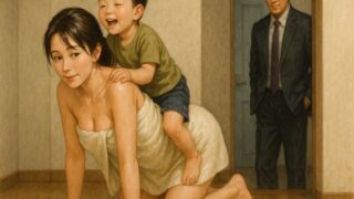 メイン登場人物喜里山恭子。渉の妻、結婚4年目。恭子:身長は161cm、体重は54kg。恭子:Fカップ、30歳。喜里山渉。恭子の旦那。結婚4年目。31歳。喜里山剛。渉と恭子の息子。3歳。渉視点(恭子視点、心理描写等も含む場合があります)自分が働いてる会社はブラック企業だ。毎日朝7時出社で帰りは夜22時以降になることもしばしばある。仕事内容は多岐にわたり、朝から深夜まで休憩もろくに取れずに働かされる。その割に給料は安いし、残業代も出ない。労働基準監督署が入れば一発アウトだろう。こんな会社にずっといると精神的に病んでくる。だが転職する行動力も気力もないから結局今の状態が続くのだ。それに自分には妻と息子がいる。守るべきものがあると、どんな状況でも頑張ろうと思えるものだ。ある日、良く世話になってる森田課長からお酒のお誘いを受けた。森田課長はもうすぐ50歳のおっさんだが、お世話になってることもあり断れずについていくことにした。その日は飲みに行く約束をしたせいか、17時に退社して、課長と一緒に居酒屋に向かった。そして2時間ほど飲んだ後、もう一軒行こうと誘われたので付き合うことにした。森田「じゃあ、次は女の子いる店に行くぞ!」渉「え・・・あー・・・。」森田「どうしたんだ。女の子好きだろ?」渉「いや、まぁ、そうなんですけど・・・」森田「なんだ?乗り気じゃないみたいだな。もしかして、風俗とかのがいいか?」渉「そういうわけじゃないんですけど・・・。妻に申し訳なくてですね。」森田「あー、そんなことか。俺なんてもうそんな気持ち全くなくなっちまったよ!笑」渉「そ、そうですか・・・。」森田「じゃあ君の家で飲むか!」渉「うちですか!?でも、子供もいるし、森田課長は女の子が居る店が良かったんじゃないんですか?」森田「子供がいた方が楽しいじゃないか!!それに、女の子なら君の奥さんで十分だよ!!」渉「・・・・・え・・・・」森田「冗談だよジョーダン!!!あははは!!」森田「早速つまみやお酒でも買って行こう!!」渉「あ、はい・・・。」前もって妻に連絡を入れれば良かったのだが、森田課長と一緒に居るのに携帯を使うのが失礼だと思ったので、買い物を済ませてそのまま家へ向かった。渉「ただいまー!」恭子「おかえりなさい!」森田「どうも奥さん、初めまして。」渉「急にごめん、こちら会社でお世話になってる森田課長。渉「森田課長と飲んでたんだけど、流れでウチで飲みなおそうってなってさ。」恭子「そうなんだ! 初めまして、主人がいつもお世話になっております。」森田「いえいえ、こちらこそ。」恭子「あまり何も用意出来ませんけど、どうぞ上がってください。」森田「ありがとうございます!お邪魔します!」・・・・森田課長はニヤニヤしながら家に上がった。俺はなんだか嫌な予感しかしなかった。森田「いやー、それにしても本当に良いお宅ですねぇ。綺麗ですし。」恭子「ふふ、ありがとうございます。」剛「おかえり〜!!!」渉「おぉ、ただいま〜!」そう言って抱き着いてくる息子の頭を優しく撫でる。森田「おぉ〜!可愛いなぁ。」森田課長頭を撫でたりほっぺを指でツンツンと突いたりしていた。剛「キャッキャッ♪」森田「よーしよし、おじさんと遊ぼうか!」剛「わーい!遊ぶぅ!」恭子「すみません、無理せずゆっくりしててくださいね。」森田「いえ、遊んでるの楽しいですよ!」森田課長はそう言って、息子と遊んでくれた。そして妻が夕飯の支度を終え、みんなで食事を摂った。森田課長「君の家に来て正解だったよ、こんな美味しいご飯が食べられるなんて幸せだ!」渉「喜んでいただけたら何よりです。」森田課長はビールを飲みながら料理を美味しそうに食べていた。妻は息子と遊んでいる。剛「ママ〜お馬さんやってぇ〜」恭子「え〜?ママ疲れちゃうよぉ」剛「えー、だめなのぉ?」森田「剛くん、おじさんがお馬になろうか?」剛「いいの!?」森田「うん、いいよ。」恭子「森田さんはさっき沢山遊んでくれたんですからゆっくりしててください。」恭子「剛、ママがお馬になってあげるけど、少しよ?いい?」剛「うん!わかったぁ!」そう言うと、恭子は四つん這いになり、その上に息子が乗る。恭子「よいしょっと・・・」改行、空白を除いた文字数 約7803文字pixivやCi-en、Fantiaなどで主に活動しております。多数の作品の中から順に販売させていただきますので、ぜひよろしくお願いいたします。(^^♪※誤字脱字等は脳内補完にて処理お願いしますm(_ _)m※本編、サンプル共にpdfファイルになっております。 d_667581